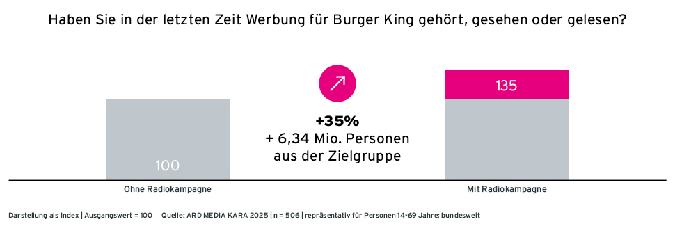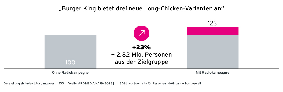 Die Kampagne hat ihre Wirkung nicht verfehlt – das zeigt eine begleitende Befragung: Die gestützte Werbeerinnerung stieg infolge der Radiokampagne um 35 Prozent – das entspricht 6,34 Mio. Personen. Ebenso konnten sich 2,82 Mio. Menschen zusätzlich daran erinnern, dass Burger King aktuell drei neue Long-Chicken-Varianten anbietet (+ 23 %). Auch die Kaufbereitschaft wurde durch die Kampagne erhöht: Für 2,48 Mio. Personen kommt Burger King infolge der Radiokampagne für einen Besuch infrage – ein Plus von 10 Prozent.