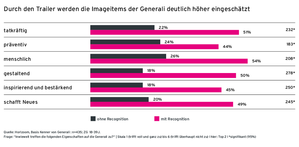 Die Imageattribute der Generali wurden durch den Audioeinsatz in der Themenwoche beeindruckend erhöht. So gab es viel Zustimmung bei Eigenschaften wie „tatkräftig“, „menschlich“, „gestaltend“. In der Gruppe, die sich an den Trailer erinnerten, gaben beispielsweise 45 Prozent an, dass sie der Marke Eigenschaften wie „inspirierend und bestärkend“ zuschreiben. In der Gruppe ohne Werbeerinnerung lag der Wert nur bei 18 Prozent.