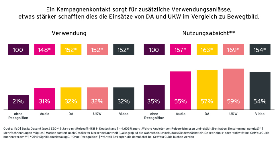 Ob UKW- oder Digital. Audiospots wirkten und konnten die Buchungswahrscheinlichkeit über GetYourGuide deutlich erhöhen. Die Verwendung in der Vergangenheit, bzw. während der Kampagne, wurde jeweils durch DA und UKW signifikant um 52 Prozent erhöht. Die Buchungswahrscheinlichkeit („Nutzungsabsicht“), also die zukünftige Verwendung, stieg durch DA um 63 Prozent und durch UKW um 69 Prozent. Jeweils im Vergleich zur befragten Gruppe ohne Recognition.