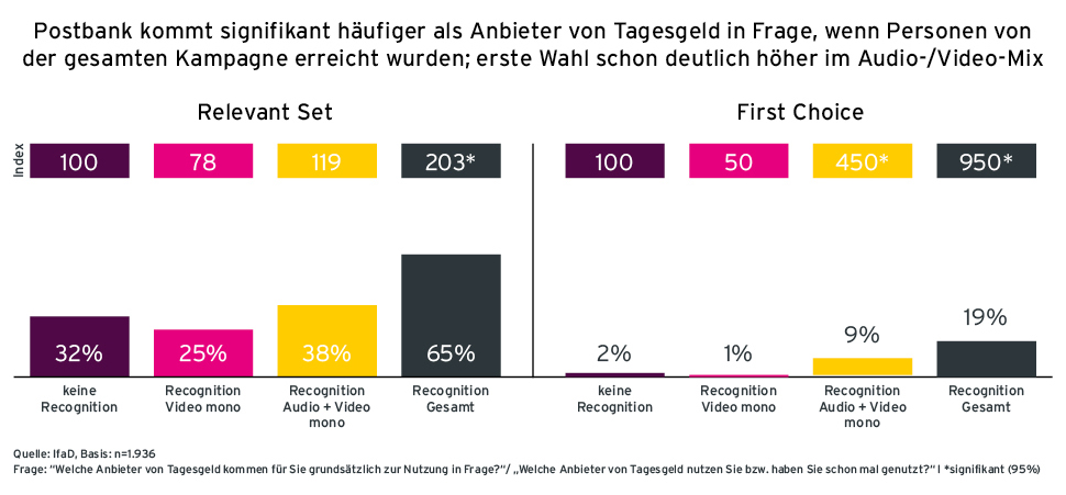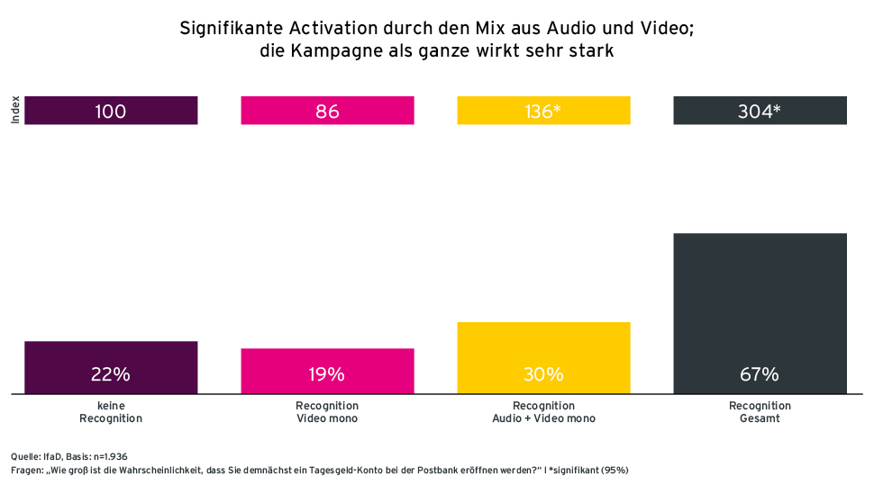 Im Vergleich zur Gruppe ohne Erinnerung an die Werbemittel, wies der Mix aus Audio und Video signifikant erhöhte Aktivierungswerte auf: Einer 22-prozentigen Wahrscheinlichkeit, demnächst ein Tagesgeld-Konto bei der Postbank zu eröffnen, standen bei Erinnerung an Audio und Video Mono starke 30 Prozent und somit ein um 36 Prozent erhöhter Wert gegenüber. Sogar hervorragende 204 Prozent höher als die Gruppe ohne Recognition lag die Gesamtkampagne mit einem Aktivierungswert von 67 Prozent.