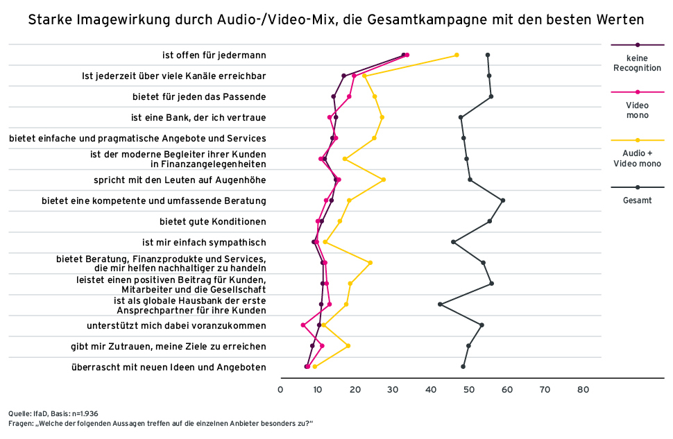 Neben einer positiven Entwicklung der Brand Emotion, konnten zahlreiche wichtige Imageitems deutlich gepusht werden. Aussagen wie „Die Postbank ist offen für jedermann“, „…spricht mit den Leuten auf Augenhöhe“ und „…bietet Beratung, Finanzprodukte und Services, die mir helfen nachhaltiger zu handeln“ trafen bei Befragten mit Erinnerung an Audio und Video Mono deutlich häufiger zu als in der Gruppe ohne Recognition. Die besten Werte wurden jeweils bei den Befragten erzielt, die sich an die Gesamtkampagne erinnerten.