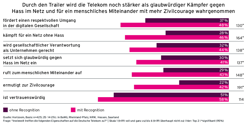 Die Themenwoche präsentierte die Deutsche Telekom erfolgreich als starken Player gegen Hass und für mehr Respekt im Netz. Die Brand Lift Analyse belegte eine deutliche Verbesserung auf kampagnenspezifischen Imageitems wie: Die Deutsche Telekom „fördert einen respektvollen Umgang in der digitalen Gesellschaft“ und „kämpft für ein Netz ohne Hass“. Doch auch kund:innenspezifische Items wie: Die Deutsche Telekom „bietet hervorragende Netzqualität“ sowie „gibt mir das Gefühl, in guten Händen zu sein“ wurden signifikant gestärkt – bei Befragten mit Erinnerung an die Themenwoche.